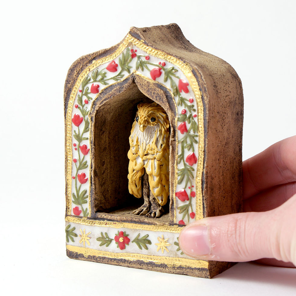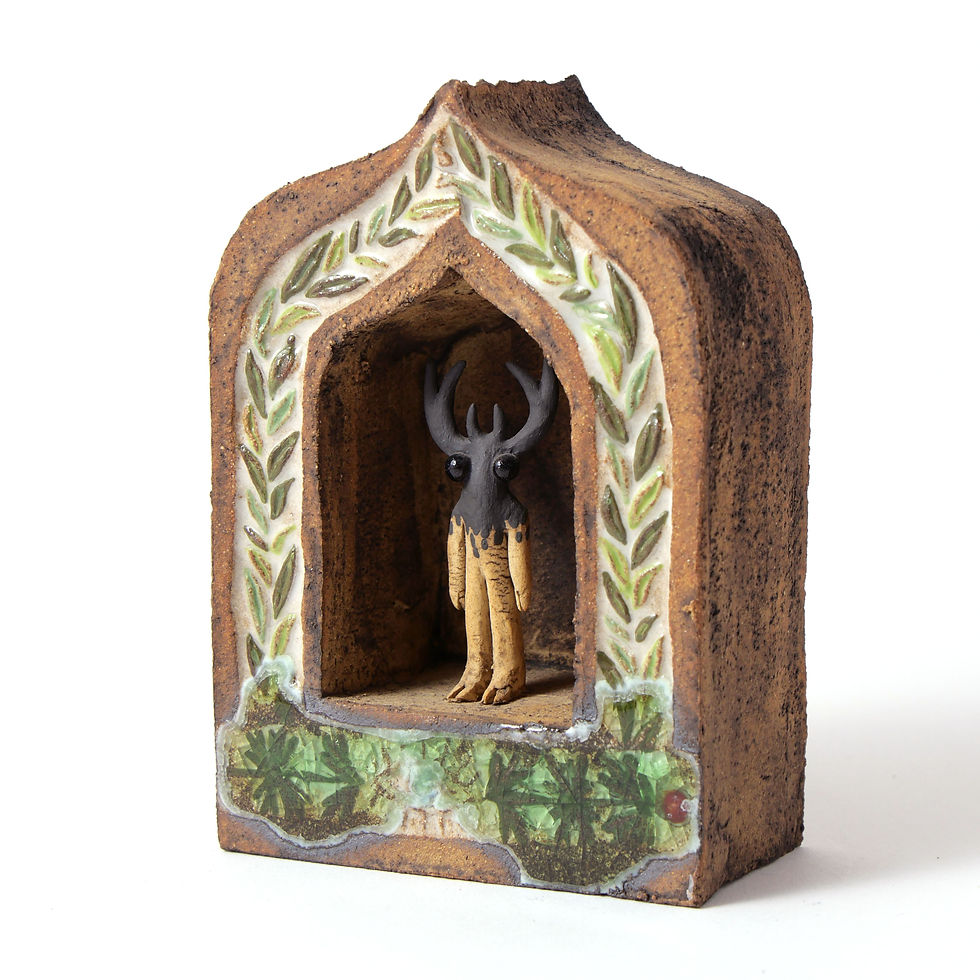 Son aspect mordoré et patiné donne l'impression d'un vieux bronze mais c'est bien une sculpture en céramique.